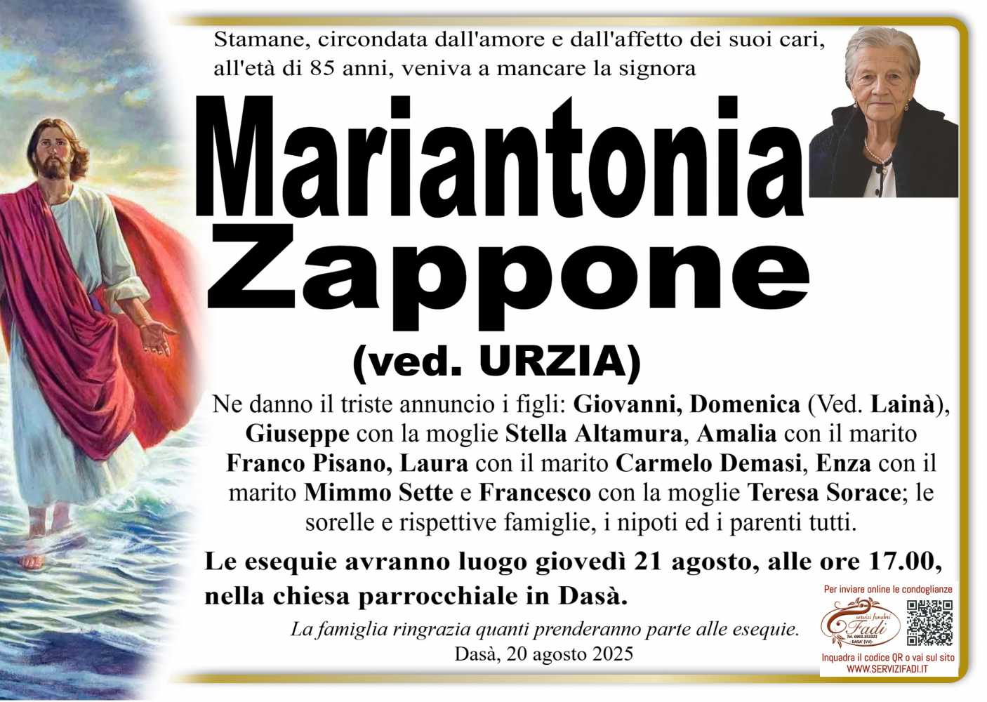 Lascia gratuitamente un messaggio di cordoglio, sarà nostra cura consegnarlo ai congiunti di Mariantonia Zappone.